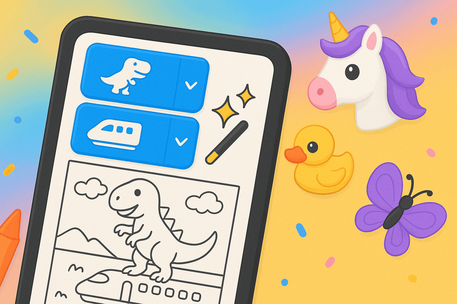 「AIぬりえ」は、こどもたちが簡単なキーワードを選ぶか自由に入力するだけで、その言葉を反映した世界に一つだけの塗り絵が生成される、新しい知育アプリです。「宇宙を冒険するネコ」「虹の上を走るユニコーン」など自由な発想を、対象年齢や文化的背景に合わせて美しい線画イラストへと変換します。